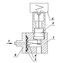 Конструкция датчика модели 1131 представлена на рисунке 1. Сенсорный блок датчика состоит из корпуса 1, рычажного тензопреобразователя 2, измерительной мембраны 3, жесткого центра со штоком 4, электронного преобразователя 5, штуцера 6.