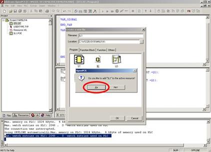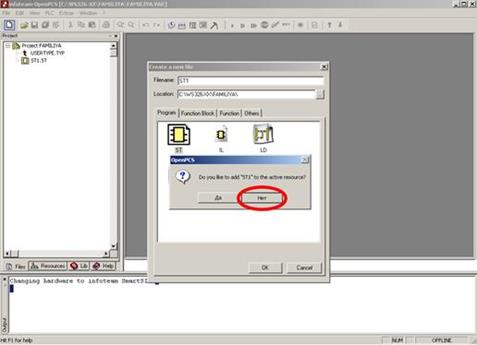 Создайте новую программу на ST ( File->New ) с именем ST1, на предложение о добавлении созданной программы к активному ресурсу ответить отказом (Рис.5.). Ознакомьтесь с ключевой для дальнейшей работы информацией: