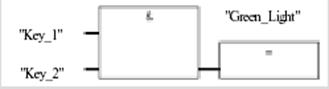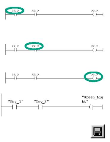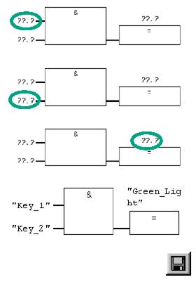. Введите символическое имя "Key_2 [Ключ_2]" для второго входа. Введите имя "Green_Light [Зеленый_свет]" для присваивания. Теперь запрограммирована вся функция AND. Если отсутствуют символы, выделенные красным цветом, можете сохранить блок. Символы отображаются красным цветом, если, например, они отсутствуют в таблице символов, или если имеет место синтаксическая ошибка. Можете также вставить символическое имя непосредственно из таблицы символов. Щелкните на знаке ??.?