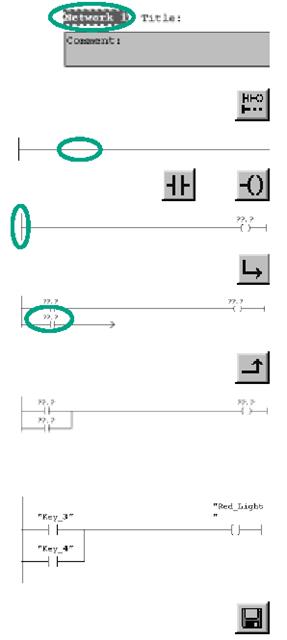 OB1 и введите, например, "Циклически обрабатываемая главная программа". Выберите путь тока для своего первого элемента. Щелкните на этой кнопке на панели инструментов и вставьте нормально открытый контакт (рис.56).