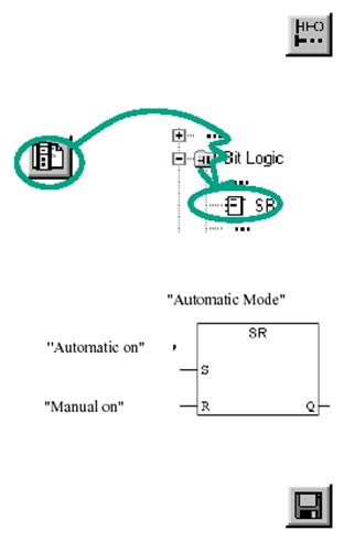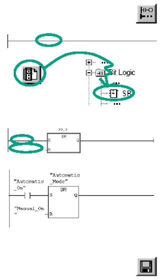 . Дважды щелкните, чтобы вставить этот элемент. Вставьте нормально открытый контакт перед каждым из входов S и R. Введите следующие символические имена перед элементом SR:
