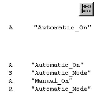 Для программирования функции памяти в списке операторов выделите Network 2 [Сегмент 2] и вставьте еще один сегмент. В первой строке напечатайте команду A с символическим именем "Automatic_On [Автоматический_режим_включен]". Завершите функцию памяти и сохраните ее. Закройте блок (рис.62).