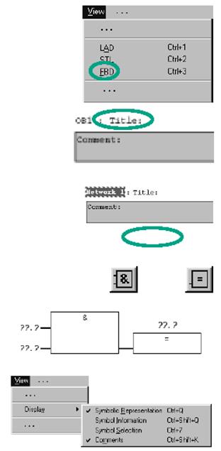 OB 1 и введите, например, "Циклически обрабатываемая главная программа". Выберите область ввода для функции AND (под полем комментария). Вставьте блок AND (&) и присваивание (=). Адреса элементов в функции AND все еще отсутствуют (рис.64). Проверьте, активизировано ли символическое представление (Symbol Representation).