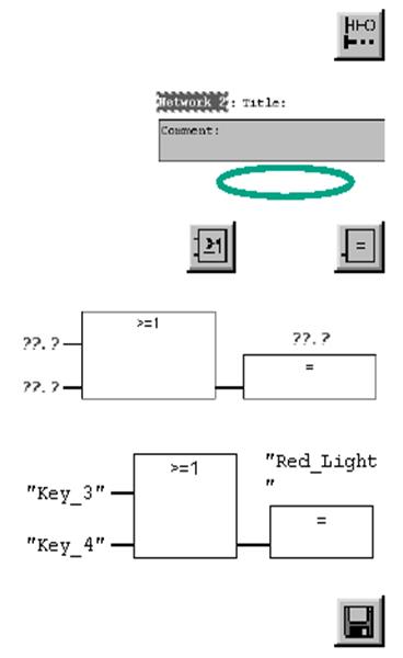 Для программирования функции OR [ИЛИ] в функциональном плане вставьте новый сегмент. Снова выделите область ввода для функции OR. Вставьте блок OR (1) и присваивание (=). В функции OR все еще отсутствуют адреса. Действуйте так же, как и для функции AND. Введите "Key_3 [Ключ_3]" для верхнего входа, "Key_4 [Ключ_4]" для нижнего входа и "Red_Light [Красный_свет]" для присваивания. Сохраните блок.