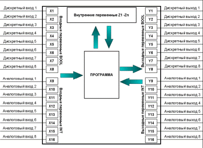 Программа, исполняющаяся в контроллере, получает информацию из внешней среды через переменные X, определенные как входные переменные. На основе полученных данных исполняющая система производит определенные программой действия и выводит результат через переменные Y, определенные как выходные. Для промежуточных вычислений служат внутренние переменные Z.