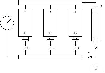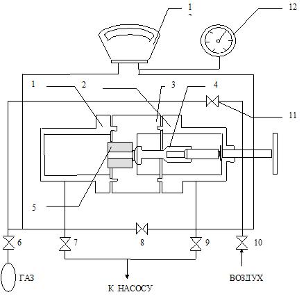Откачка газа из установки осуществляется через вентили 3 и 5 при закрытом вентиле 11 и открытом байпасном кране 12 с помощью форвакуумного насоса 4. Напуск газа в вискозиметр производится с помощью вентиля 11 при открытом байпасном кране 12.