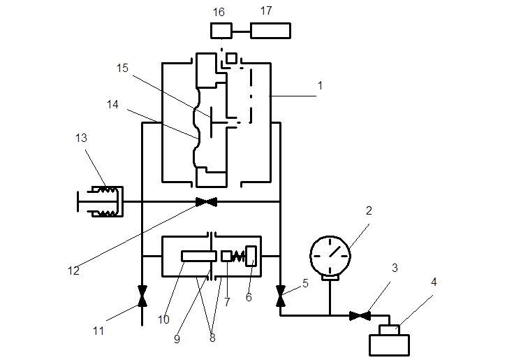 1-емкостной датчик давления; 2-образцовый вакумметр; 4- форвакуумный насос; 3,5,11-вентили; 7-запирающее устройство; 8-объемы с капиляром;9-перегородка; 10-капиляр; 12-байпасный кран; 13-сильфонное устройство;14-мембрана из бериллевой бронзы; 15-диск-электрод; 16-LC-генератор; 17-частотомер.