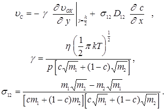 Таким образом, скорость скольжения пропорциональна средней длине свободного пробега и увеличивается с уменьшением давления. Константа скольжения близка к единице и зависит от рода газа и типа взаимодействия молекул со стенкой. В простейшем случае, когда на стенке происходит диффузное рассеяние (равновероятное во все стороны с энергией стенки),теоретическое значение s равно 1,13.