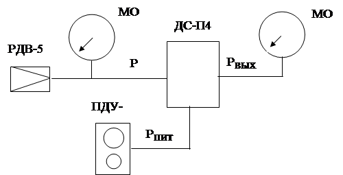 Схема лабораторной установки приведена на рисунке 1. Установка содержит технические средства, смонтированные на стенде: преобразователь типа ДС-П4 и два образцовых манометра типа МО с классом точности 0,25. Входной сигнал преобразователя создается редуктором типа РДВ-5. Питание преобразователя сжатым воздухом осуществляется от панели управления типа ПДУ-А.