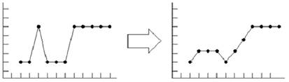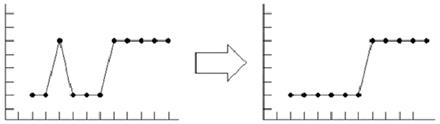 На графике по горизонтали отложены координаты точек, а по вертикали –их яркости. В результате получается профиль строки. На левом графике изображен профиль до фильтрации, на правом – после.Улучшенный вариант алгоритма усреднения заключается в том, что значение пиксела изменяется на среднее только при условии, что оно отличается от него более чем на величину порога Ψ. См. пример на рис. 2.