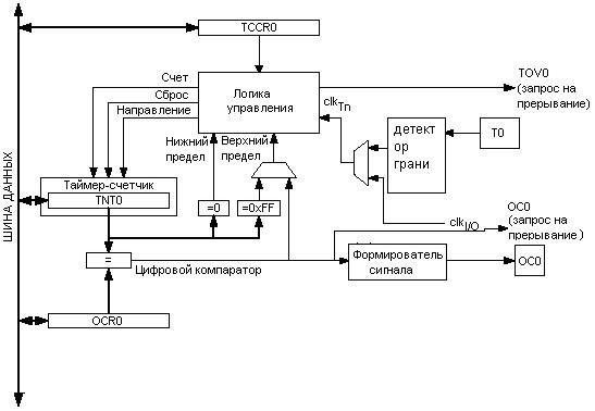 - два 8-разрядных таймера/счетчика с отдельным предварительным делителем, один с режимом сравнения;