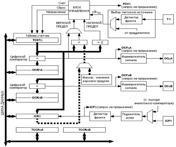 Регистры захвата обновляются содержимым соответствующего счетчика (TCNTn) при каждом определении условия захвата на входе ICPn (или альтернативно на выходе аналогового компаратора для таймера-счетчика 1).