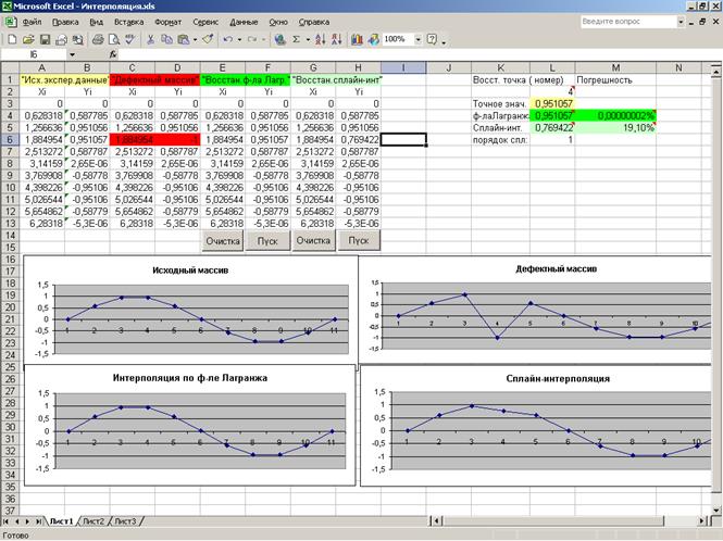 - Набрать программу по формулам полиномиальной (формула Лагранжа для N узлов) и сплайн-интерполяции (в качестве сплайна использовать полином Лагранжа для соседних узлов) для восстановления значения «потерянной» точки. Исходные данные считывать из столбцов (C3:D13), результаты записывать соответственно в столбцы (E3:F13) и (G3:H13).