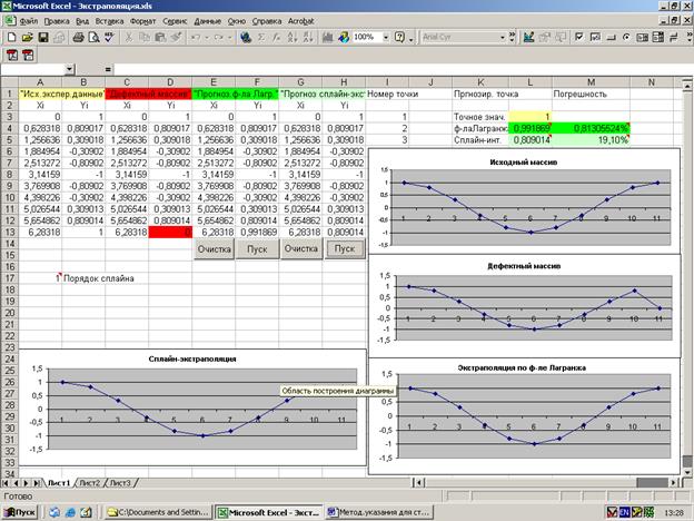 - Взять исходные данные из предыдущей лабораторной работы (Экстраполяция), поместить их на место «дефектного» массива и повторить расчет. Рассчитать погрешность восстановления «потерянной» точки и сделать выводы.