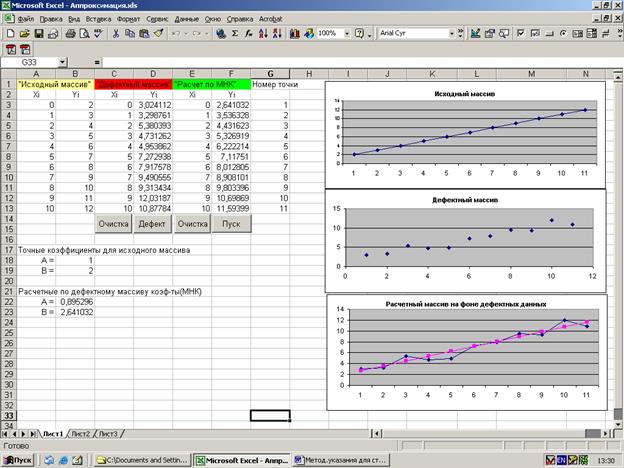 - Вычислить по этим коэффициентам расчетное значение Y и занести в столбцы (E3:D13). Под столбцом разместить кнопки «Пуск» и «Очистка». Результаты представить в виде графика на той же диаграмме.
