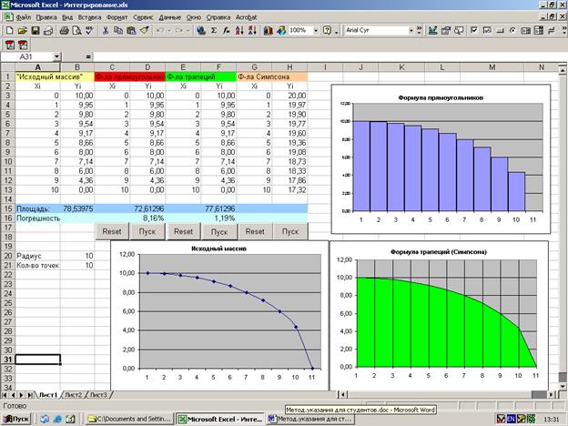 - Для определения погрешностей вычислить площадь заданной фигуры аналитически и записать ее в ячейки C2, D2, E2. Набрать программу расчета погрешности и занести результаты в ячейки C3, D3, E3. Сделать вывод.