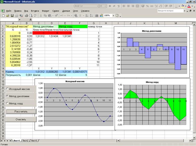 - Дополнительное задание: в п.3 заменить формулы метода дихотомии на формулы метода хорд и повторить расчет. Сравнить с методом дихотомии по погрешности и количеству шагов.