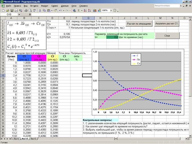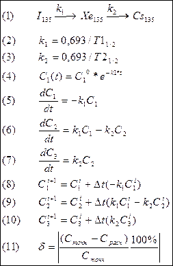 - Проверить правильность расчетов (за время, равное периоду полураспада концентрация С1 должна уменьшиться ровно в 2 раза) и отладить программу.