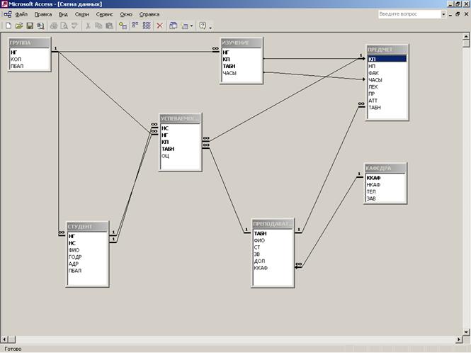 - Разработать модель данных предметной области, например, - «Учебный процесс в ВУЗе» (см. лекцию). Определить перечень таблиц данных, например, - «предметы», «преподаватели», «группа», «студенты», «успеваемость», «кафедра», «изучение»
