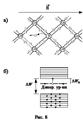 Рассмотрим решетку четырехвалентного германия с примесью пятивалентных атомов фосфора (рис. 8, а). Четыре электрона фосфора образуют ковалентные связи с соседними атомами германия, а пятый валентный электрон оказывается как бы лишним и легко отщепляется от атома за счет энергии теплового движения, образуя странствующий свободный электрон. В результате отщепления электрона не происходит нарушения ковалентных связей, т.е. дырка не образуется. Следует отметить, что в окрестности атома примеси возникает избыточный положительный заряд, но он связан с атомом и перемещаться по решетке не может. Таким образом, в полупроводнике с пятивалентной примесью имеется только один вид носителей тока – электроны. Соответственно говорят, что такой полупроводник обладает электронной проводимостью