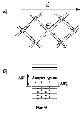 На схеме уровней (рис. 9, б) акцепторные уровни расположены недалеко от потолка валентной зоны в запрещенной зоне. Образованию дырки отвечает переход электрона из валентной зоны на акцепторный уровень (рис. 9, б).