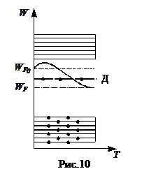при 0 К расположен посередине между зоной проводимости и донорными уровнями (рис. 10). С повышением температуры все большее число электронов переходит с донорных состояний в зону проводимости, но, помимо этого, возрастает и число тепловых флуктуаций, способных возбуждать электроны из валентной зоны и перебрасывать их через запрещенную зону энергий. Поэтому при высоких температурах уровень Ферми имеет тенденцию смещаться вниз (рис. 10 – сплошная кривая) к своему предельному положению в центре запрещенной зоны, характерному для собственного полупроводника.