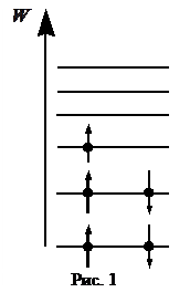 , который гласит, что в любой квантовой системе (атоме, молекуле, кристалле и т.д.) на каждом энергетическом уровне может находиться не более двух электронов, причем собственные моменты (спины) электронов, занимающих одновременно один и тот же уровень, должны иметь противоположные направления. На рис. 1 схематически показано размещение электронов по уровням в основном состоянии атома, имеющего пять электронов. Стрелки указывают направления спинов.