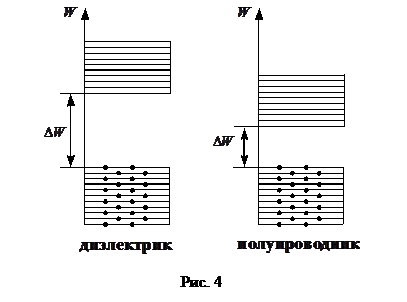 Если полностью заполненная валентная зона отделена запрещенной зоной от зоны проводимости, то твердое тело является диэлектриком (изолятором) или полупроводником. Различие лишь в том, что ширина запрещенной зоны у диэлектриков значительно больше ширины этой зоны у полупроводников (рис. 4).
