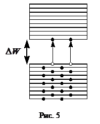 Проводимость чистых полупроводников (собственная проводимость) возникает в результате перехода электронов с верхних уровней валентной зоны в зону проводимости (рис. 5). При этом в зоне проводимости появляется некоторое число носителей тока – электронов, занимающих уровни вблизи дна зоны; одновременно в валентной зоне освобождается такое же число мест на верхних уровнях. Такие свободные от электронов места на уровнях заполненной при абсолютном нуле валентной зоны называются дырками