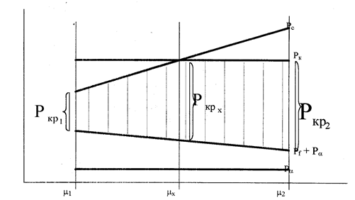 (зона надежного сцепления), будут соответствовать величинам усилия на крюке трактора при работе его в разных почвенных условиях, находящихся по сцепным свойствам в диапазоне меньшей и большей величин коэффициента m;