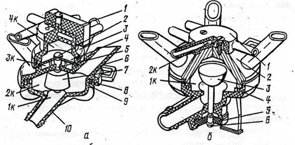 Рис. 2. Коллектор доильного аппарата АДУ-1:а —- трехтактный: 1 — клапан отключения коллектора от вакуума; 2 — шайба прижимная; 3 — распределитель; 4 — мембрана; 5 — стержень клапана; 6 — корпус; 7 — клапан; 8 — прокладка; 9 — основание; 10 — выходной штуцер; 1к — камера постоянного вакуума; 2к — камера переменного вакуума; Зк — камера постоянного атмосферного давления; 4к — камера переменного вакуума (распределительная); в — двухтактный: 1 — распределитель; 2 — корпус; 3 — клапан; 4 — основание; 5 — шайба; 6 — шплинт; 1к — камера постоянного вакуума (молокосборная); 2к - распределительная камера (переменного вакуума).