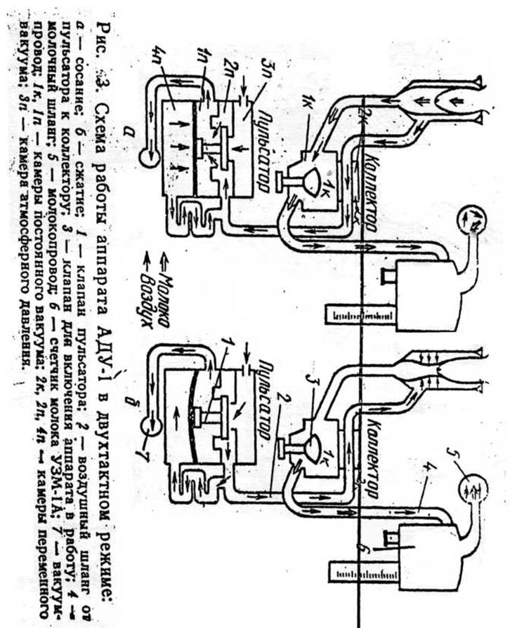Схема работы доильного аппарата АДУ-1 в двухтактном режиме приведена на рис. 3.