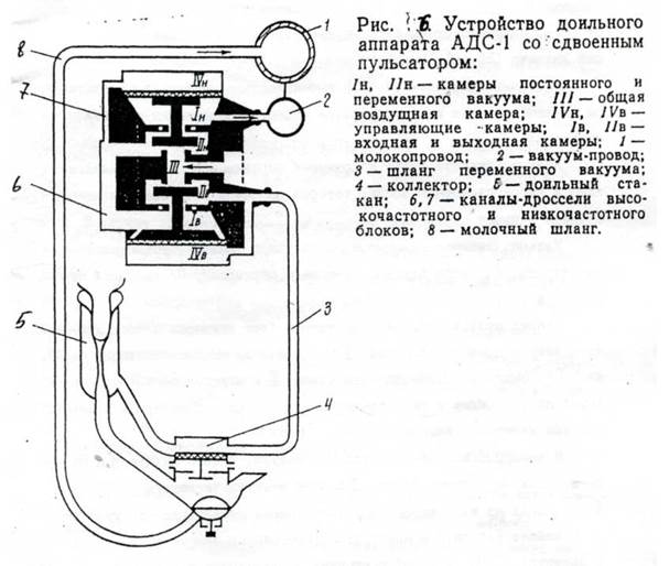 Доильный аппарат АДС состоит из узлов серного аппарата АДУ-1 (доильные стаканы, коллектор, шланги) и специально раэработанного вибропульсатора, задающего режим работы доильного аппарата. Пульсатор АДС-1 состоит из двух блоков, объединенных в одном корпусе. Один из этих блоков представляет собой низкочастотный пульсатор, работавший с частотой 60 пульсаций в минуту Гц, второй - высокочастотный, работающий с частотой 600-700 пульсаций в минуту (10-12 Гц). Низкочастотный пульсатор обеспечивает выдаивание молока из вымени. Высокочастотный за счет быстрых колебаний сосковой резины создает раздражение соска подобно эффекту, выполняемому теленком при сосании, в результате чего обеспечивается более полное выдаивание молока и снижается вредное воздействие вакуума на сосок.