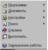«Программы». Используется для запуска программ. Щелчок на этом элементе меню открывает другое меню, а некоторые элементы этого меню ведут к следующему меню. Меню переходит из одного меню в другое, пока не обнаружится нужная программа.