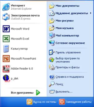 1) «Документы». Это меню показывает несколько последних документов, которые были в работе. Достаточно выбрать мышью нужный документ, чтобы запустить соответствующую программу и открыть его. Если, например, выбрать документ Word – файл с расширением *.doc, запускается программа Word и в ней открывается выбранный файл.