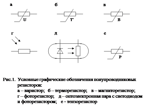 Условные обозначения полупроводниковых резисторов приведены на рис.1. Наличие полупроводниковых резисторов с таким широким спектром зависимостей позволяет использовать их в разрабатываемой радиоэлектронной аппаратуре для решения множества разнообразных задач: