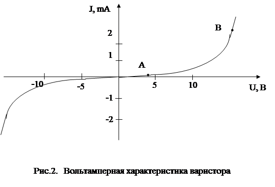 - 3-я цифра - порядковый номер разработки (как в нашем примере), или величину классификационного напряжения варистора (напр. СН1-10-47). Вольтамперная характеристика (ВАХ) варистора нелинейна и симметрична (рис.2).