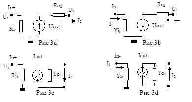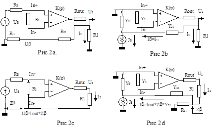 . Выходное напряжение Uout = K(p)×Uin следует рассматривать как зависимый источник. Элементы Ri или Yi – входное сопротивление или проводимость, Rout – выходное сопротивление, являются компонентами модели реального операционного усилителя (ОУ), образующего КПП. Присутствующая во всех схемах ОС отрицательна (ООС), так как петля ОС замыкается на инвертирующем входе ОУ.