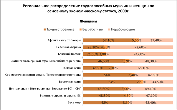 • Среди женщин в большинстве развитых регионов и в некоторых слаборазвитых регионах широко распространена неполная занятость. Доля частично занятых растёт практически повсеместно как среди женщин, так и среди мужчин.