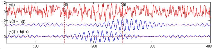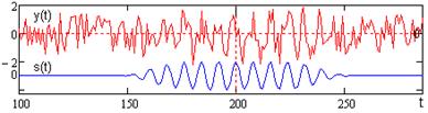 В качестве примера на рис. 12.5.3 приведен радиоимпульсный сигнал s(t), форма которого хорошо известна априорно, и зашумленный входной сигнал y(t) = s(t) + q(t), при этом мощность шумового сигнала q(t) в 2 раза больше мощности радиоимпульса.