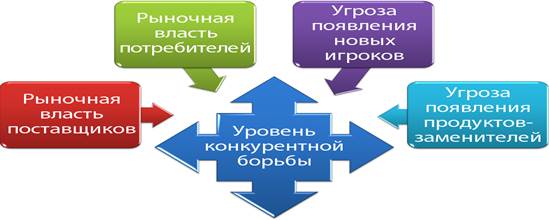 «Анализ пяти сил Портера» включает в себя три силы «горизонтальной» конкуренции: угроза появления продуктов-заменителей, угроза появления новых игроков, уровень конкурентной борьбы; и две силы «вертикальной» конкуренции: рыночная власть поставщиков и рыночная власть потребителей (рис. 1).