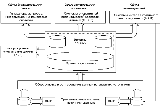 Данные из оперативных систем и внешних источников подвергаются различным преобразованиям, согласованию и загружаются в централизованное хранилище, которое содержит всю информацию, необходимую для всевозможных процессов принятия решений, но оно не ориентировано на выполнение тех или иных прикладных функций и с этой точки зрения является нейтральным по отношению к приложениям. Для того чтобы существующие хранилища данных способствовали принятию управленческих решений, информация должна быть представлена аналитику в нужной форме, то есть он должен иметь развитые инструменты доступа к данным хранилища и их обработки. Для информационного обеспечения отдельных функционально замкнутых задач используются так называемые витрины данных