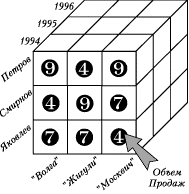 В основе концепции OLAP лежит принцип многомерного представления данных. Понятие о многомерных пространствах - эвклидовых и неэвклидовых - появилось в математике в XVIII-XIX веках, великий русский ученый В.И.Вернадский первым предложил их использование для анализа природных явлений: "Земное пространство всегда есть физико-химическое пространство. Очевидно, оно многообразно. Многообразие это может выясняться только научным наблюдением, и возможно, что мы можем выйти здесь за пределы эвклидовой геометрии, ибо все геометрии одинаково правильны и какие из них проявляются в окружающей нас среде, мы не знаем". В экономико-математическом моделировании предприятие можно описать вектором в многомерном пространстве с компонентами: затраты на рабочих, затраты на станки, затраты на патенты, деньги на счету и т.д. План предприятия - алгоритм преобразования этого вектора, в простейшем случае - матрица, на которую умножают вектор. Набор последовательных значений вектора, характеризующего предприятие, образует траекторию его развития (конечно, завод стоит на месте, меняются его параметры). Отличие предприятия от другого или от идеала можно охарактеризовать расстоянием между концами соответствующих векторов, вычисляемым по теореме Пифагора, но в многомерном пространстве. Обобщенную характеристику предприятия - стоимость его акций - можно оценить с использованием процедуры свертки, например, как объем многомерного параллелепипеда, в котором вектор является диагональю. При этом обнуление одного из компонент вектора, например, отсутствие оборотных средств, обесценивает предприятие в целом.