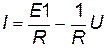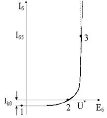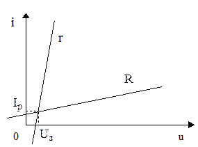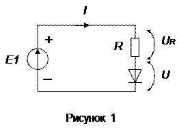Пусть прямое включение диода реализовано в схеме, изображенной на рисунке 1. В соответствии с алгоритмом построения нагрузочной прямой, ее уравнение имеет вид: . Тогда она расположится на ВАХ диода следующим образом (рисунок 2) и будет перемещаться параллельно самой себе при изменениях Е1. Абсцисса рабочих точек показывает значение напряжения U, падающего на диоде.