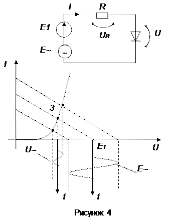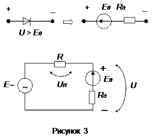 Приняв в качестве модели диода схему замещения при кусочно-линейной аппроксимации ВАХ, для входного гармонического сигнала получим расчетную схему (рисунок 3). Тогда для положительной полуволны Е~