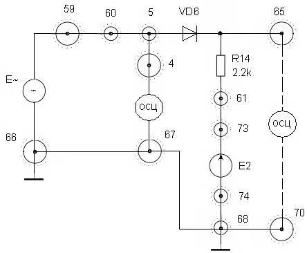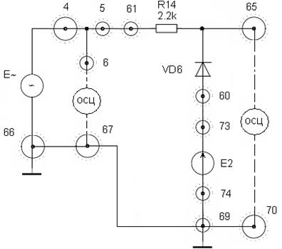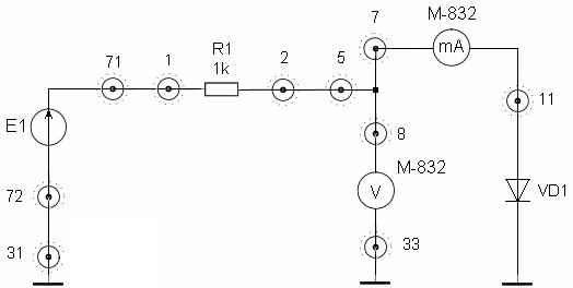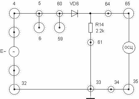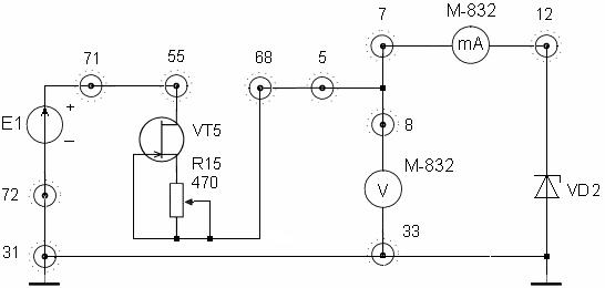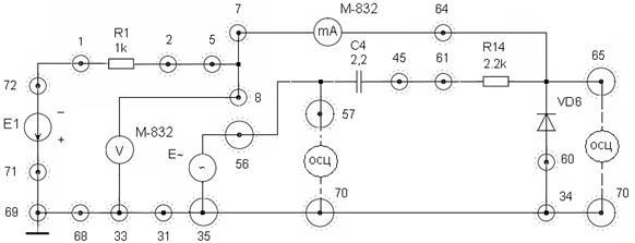 При желании снять ВАХ диода VD6 для последующего ее использования при анализе схем выпрямителей и ограничителей «токовый» М-832 подключается к гнезду 60, а гнездо 64 заземляется на гнездо 34 макета.