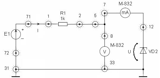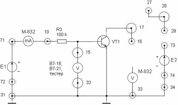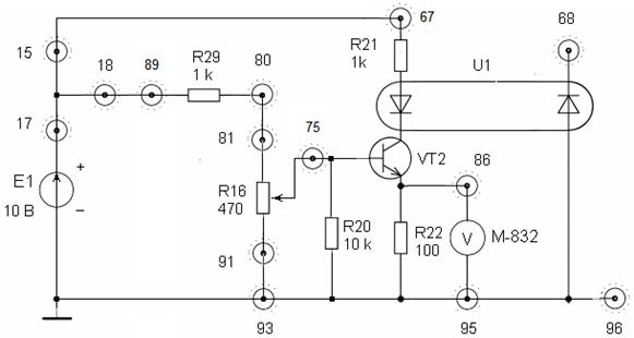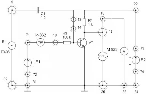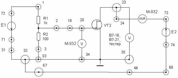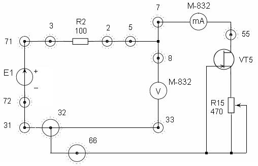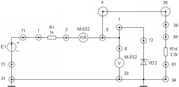 ) для фотодиодного режима ФД. Для этого осуществите соединения: 68 - миллиамперметр М-832 – 65 - R13 (или R14) – 66 (или 73)-28- +Е1. Установить Е1 = 10 В. Данные занесите в таблицу 3.
