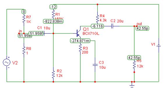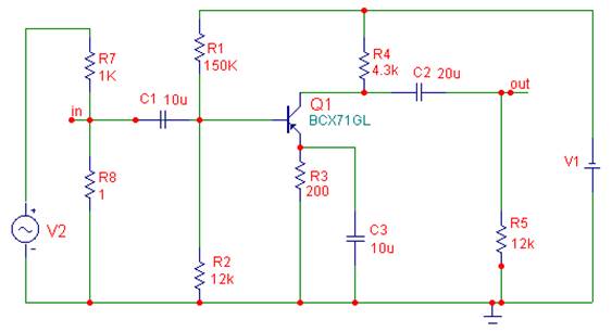 Для моделирования при выполнении работы предлагается однокаскадный усилитель напряжения (рис. 1).