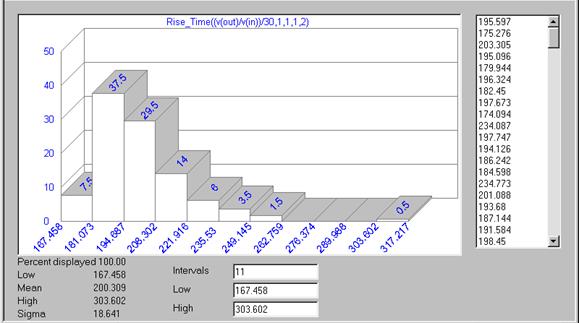 Значения выбранной характеристики F во всех реализациях выведены в окне в правой части экрана. Ниже него приведено окно, в котором можно задать количество интервалов разбиения, области определения анализируемой характеристики F (Intervals) и значения ее границ (Low, High).