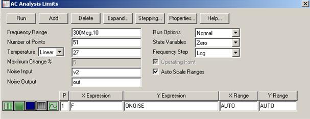 В этом окне (рис. 11) пользователь должен в графах Y Expression указать имя переменной ONOISE или INOISE, выводимой на графики, а также задать диапазон частот анализа. Заметим, что одновременно со спектральными плотностями шума нельзя выводить на графики другие переменные.